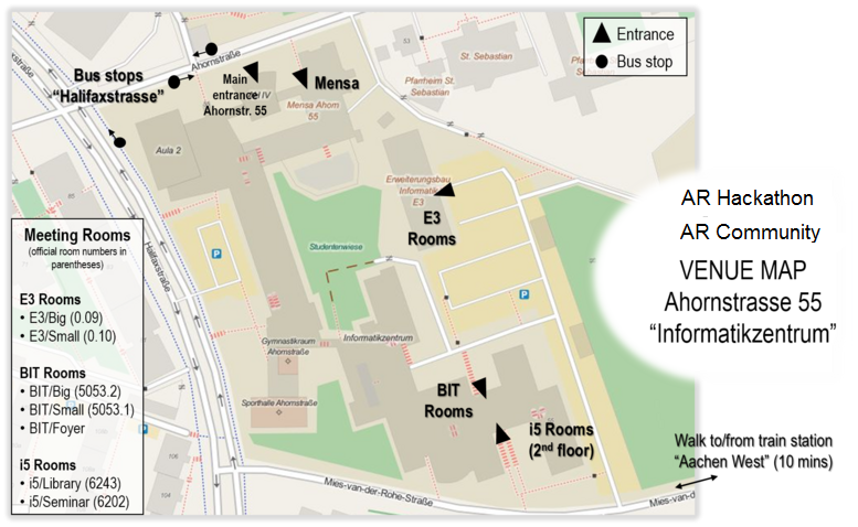 The AR Community meeting will take place in the E3 seminar and the B-IT seminar room on the campus of the RWTH Aachen University in Aachen, Germany. Click on the thumbnail for higher resolution.