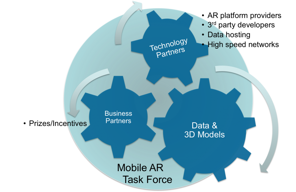 This initiative is led by people who are passionate about the worldwide adoption of Augmented Reality by the public who visits and lives in urban environments. Task Force members include: